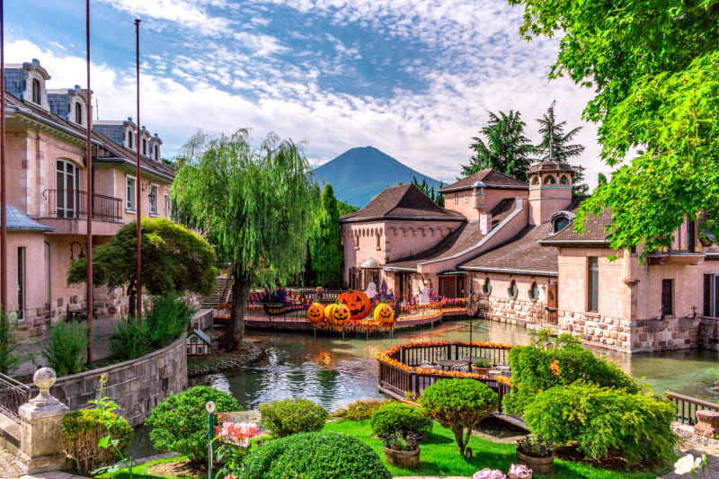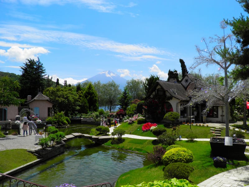 館内でオルゴールの音色を満喫したあとは、富士山をバックに異国情緒ただよう庭園を散策。バラやハーブなどの豊かな自然のなかに、メルヘンチックな建物が並び、まるでヨーロッパへ小旅行に訪れた気分になれます。