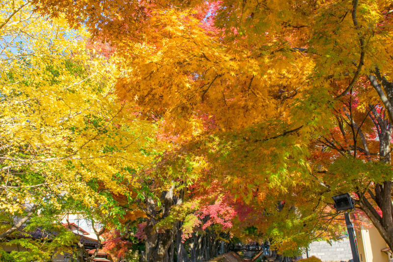 『河口湖もみじ回廊』は、河口湖北岸にある梨川沿いにある、約60本もの巨大もみじが並ぶ紅葉の有名スポット。赤や黄色、オレンジなど彩り豊かな紅葉が連なり、まるでトンネルのような景色が広がっています。河口湖周辺で毎年開催される「富士河口湖紅葉まつり」のメイン会場として、シーズン中は飲食店やお土産屋が軒を連ね、多くの人で賑わうときも。さらにライトアップも行われるため、昼間とはまたすこし違った雰囲気も楽しめます。
