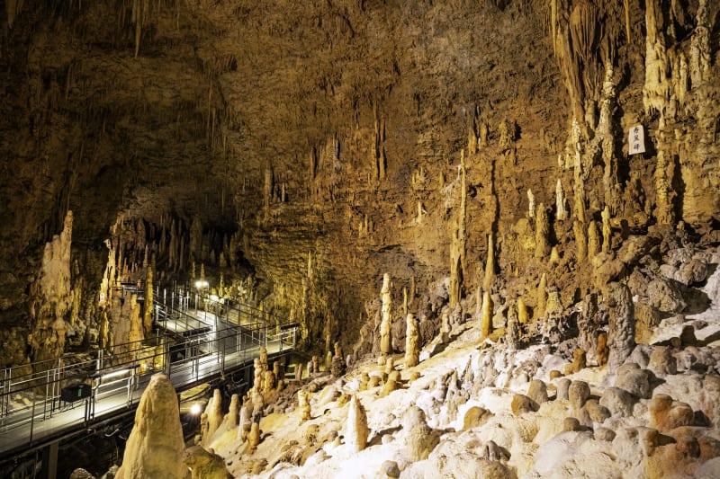 石灰分を多く含む水が流れてくる環境から、県外の鍾乳洞にくらべると成長が早く、つらら石は3年に1mmというスピードで成長しているそう。それでも気の遠くなりそうな時間をかけて少しずつできた巨大な鍾乳石。洞窟に広がる圧巻の光景に、自然の力を感じます。