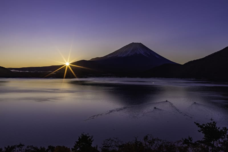 千円札の裏側の図柄にも描かれている、美しい逆さ富士がみられる『本栖湖(もとすこ)』。富士五湖のなかで、最も水深が深く透明度が高い湖ともいわれています。湖を取り囲むように山々が連なり、桜や紅葉など四季折々の自然が味わえることも魅力のひとつです。
