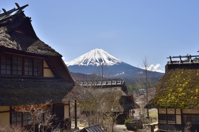 『西湖いやしの里根場』は、西湖の畔に約20棟の茅葺き屋根の建物が並ぶ野外博物館。富士山を正面に構える土地に集落が広がっていたことから、かつては「日本一美しい」ともいわれていた観光集落です。