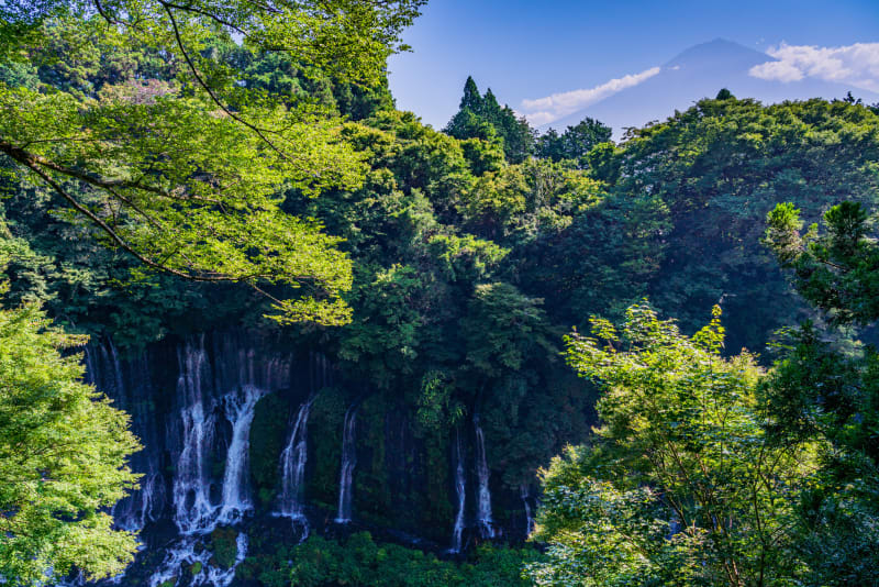 『白糸の滝』は日本の滝百選にも選ばれている富士宮市にある景勝地。高さ約20m、幅約150mの崖から、富士山の雪解け水が絹糸のように流れ出ています。崖のところどころから細く湧き出る滝の景色は、とても繊細で神秘的。