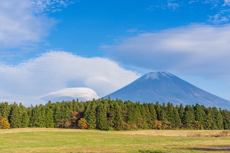 『朝霧高原』は、富士山の西側の麓、標高700m~1,000mに広がる高原です。高原には牛も放牧されており、奥に広がる富士山とのどかな風景が楽しめます。