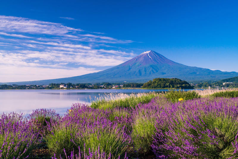 四季折々に咲く花と湖越しに見える富士山のコラボレーションは絶景! 春は桜やチューリップ、夏はラベンダー、秋はコキアや紅葉など1年を通して風にそよぐ花々を鑑賞できます。