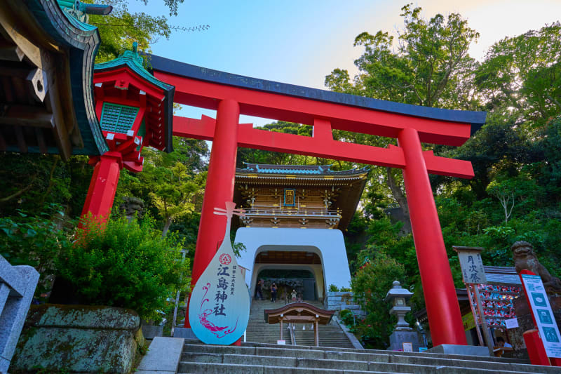 江ノ島弁財天仲見世通りを進んでいくと『江島神社』の入り口にある、朱い鳥居が見えてきます。江ノ島神社は『辺津宮』『中津宮』『奥津宮』の3つの社殿をもつ神社。