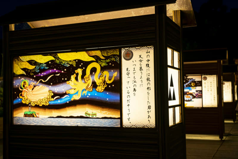 江ノ島の夏の風物詩『江ノ島灯籠』は、江ノ島一帯に約1,000基もの灯籠が設置され、やさしい光に包まれた幻想的な景色が楽しめるイベント。江ノ島の伝説「天女と五頭龍」にちなんだ灯籠や、湘南の風景が描かれた灯籠など、さまざまなデザインの灯籠が灯されています。昔ながらの影絵遊びを体感できるスポット「江ノ島かげ絵ひろば」もあり、夜の江ノ島をロマンチックに、そして楽しく過ごすこともできますよ。