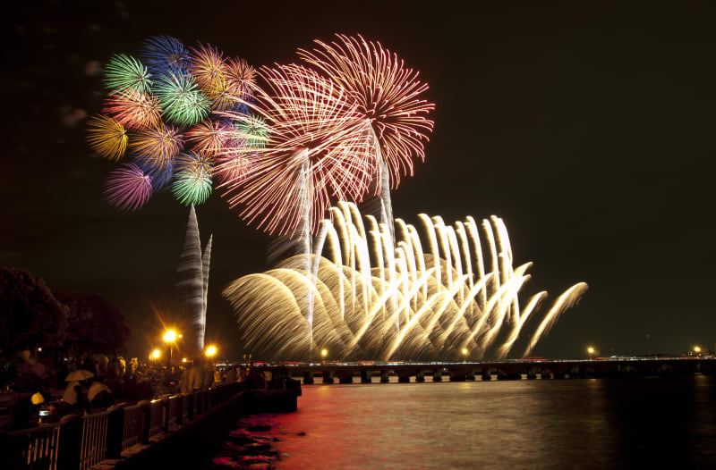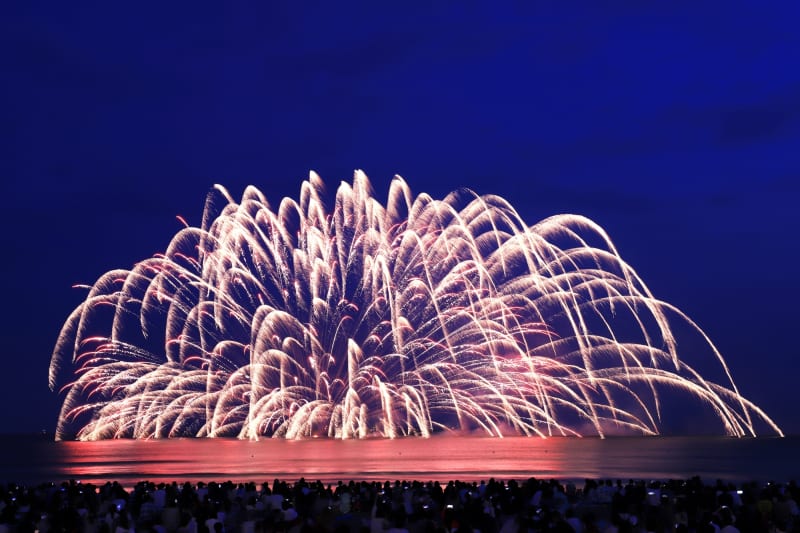 昭和23年から続く『鎌倉花火大会』は、由比ヶ浜海岸・材木座海岸を舞台に行われる夏の大人気イベント。約2,500発もの花火が打ち上げられ、風情ある鎌倉の街がカラフルに照らされます。見どころは、沖合の船から海に投げ入れられる水中花火。鎌倉の海が花火の色で鮮やかに輝く光景は必見です。