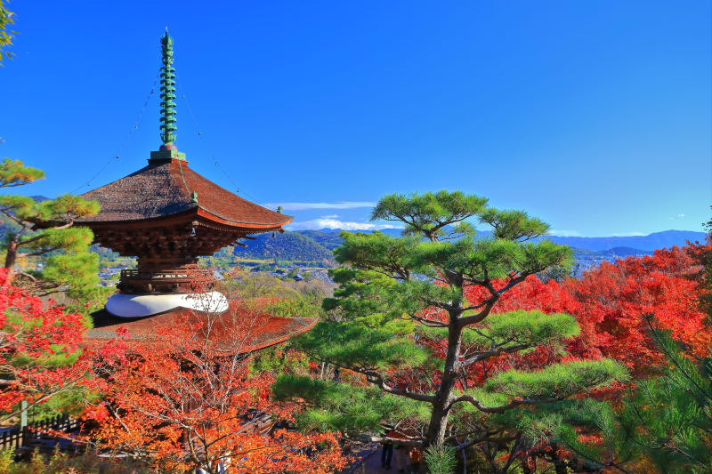 石段沿いにカエデが並び、赤や黄色など彩り豊かな景色をすぐそばで楽しめます。山の中腹にあるので、境内や多宝塔から、赤く染まる紅葉と京都市内を一望できるのも魅力のひとつ。