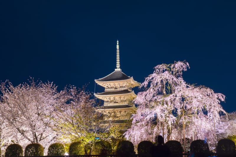 東寺は春にも夜間拝観が行われ、五重塔と夜桜のライトアップを見られるのが魅力。例年は4月下旬から5月下旬に開催されています。