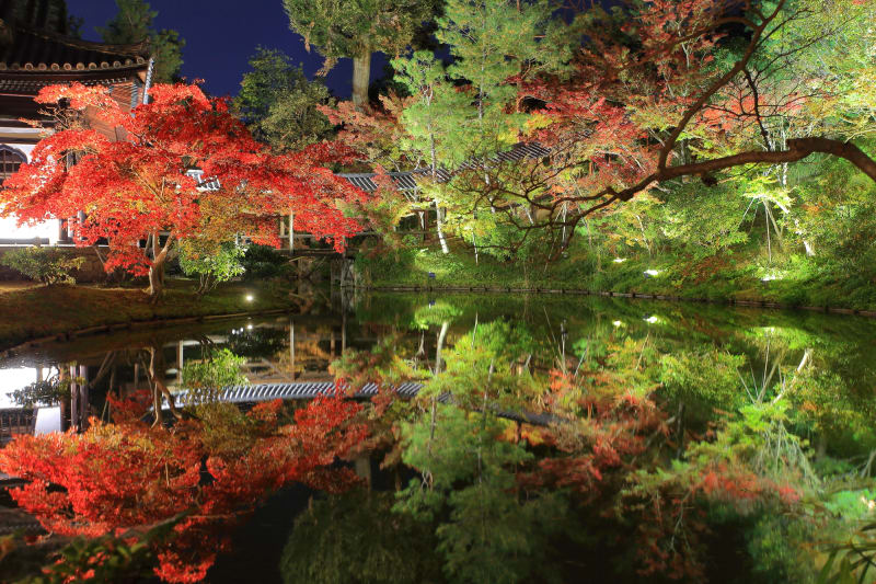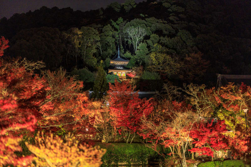 例年、ライトアップは寺宝展とともに11月上旬から12月上旬にかけて開催。紅葉で埋め尽くされた若王子山を背景に、多宝塔がライトで照らされる風景は、より荘厳さが際立ち見ごたえがあります。
