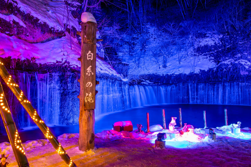 夏や冬には、色鮮やかな光が白糸の滝を照らす「プロジェクションマッピング」も開催されています。訪れる前にライトアップ期間をチェックしておくのがおすすめ!