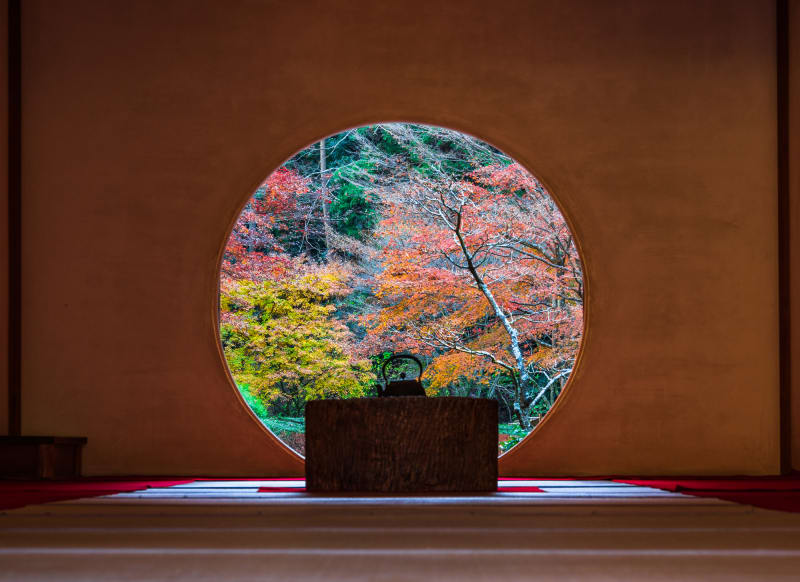 特に、紅葉の時期に公開される「本堂後庭園」は必見。「悟りの窓」と呼ばれる円窓からは、額縁に飾られた絵画のような紅葉を鑑賞できますよ。