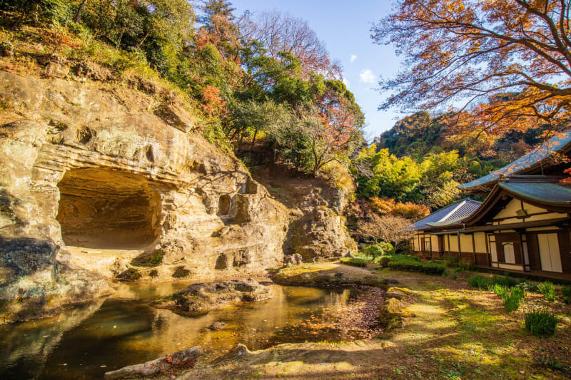 また、境内にある、かつて大洞窟を座禅の場とした「名勝瑞泉寺庭園」にも注目してみて。独特の造りの庭園を紅葉が彩る景色は、瑞泉寺でしか見られない荘厳な景色です。