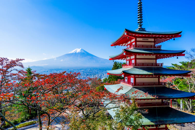 標高3,776m、日本を象徴する高峰「富士山」。どの季節に訪れても大きな感動が得られる日本の名所ですが、秋は色鮮やかな紅葉が富士山を囲み、よりカラフルで魅力あふれる景色を楽しめます。