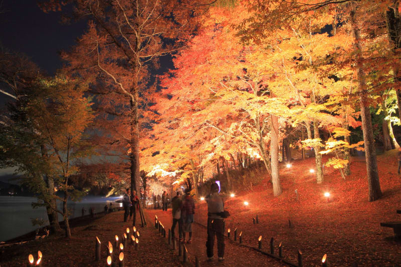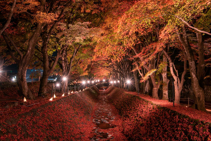 毎年、紅葉が見ごろを迎える10月下旬から11月上旬には「夕焼けの渚・紅葉祭り」が開催されます。期間中はライトアップも行われ、全長600mの紅葉回廊は、よりロマンチックな景色に!