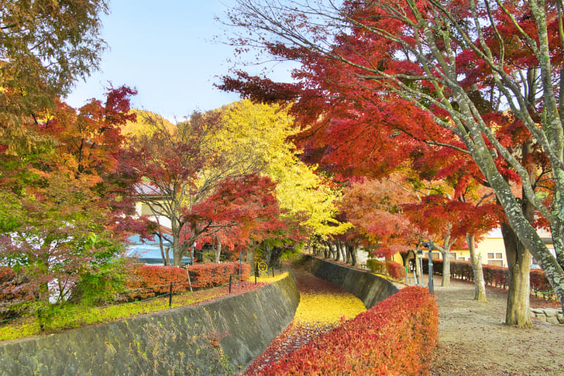 『河口湖もみじ回廊』は、河口湖周辺の紅葉スポットのなかでも特に有名な紅葉名所。回廊という名の通り、梨川を中心に約60本もの巨木モミジが広がっており、色鮮やかな紅葉のアーチが楽しめるスポットです。