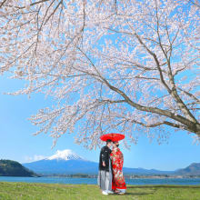 河口湖の北岸に位置する、彩り豊かな花々で有名な公園『大石公園』。湖畔に沿って敷かれた「花街道」と呼ばれる遊歩道では、目の前に裾野を広げる富士山と公園内を彩る四季折々の花木を鑑賞できます。