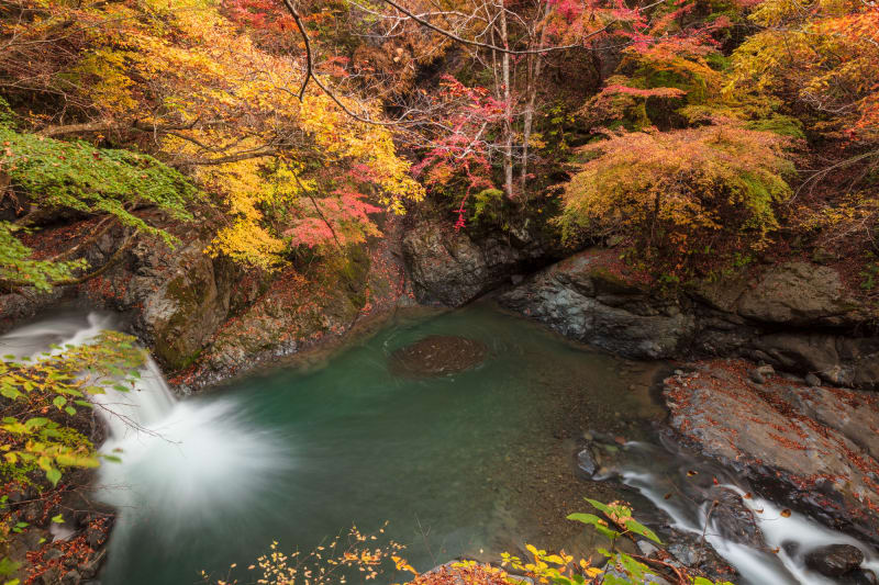 富士川町にある渓谷『大柳川渓谷』。大自然の中を1時間半かけて進むトレッキングコースが人気で、紅葉の時期はモミジに染まる景色を眺めながら散策を楽しめるスポットです。