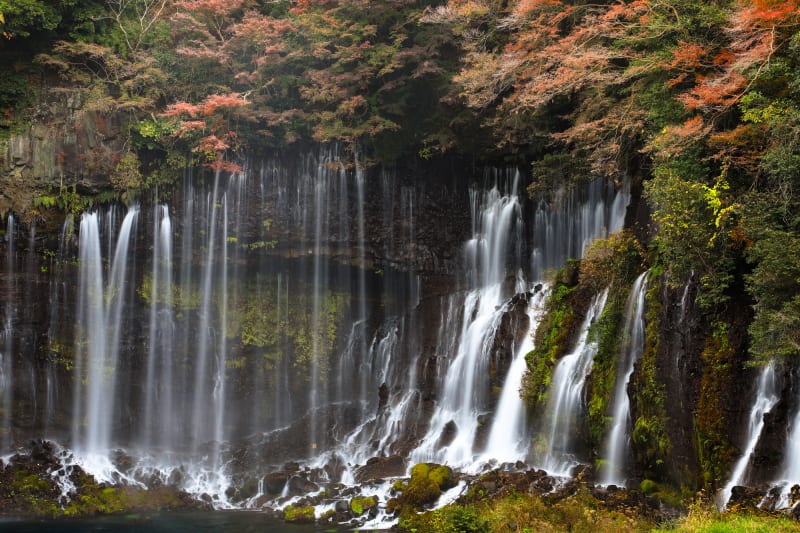 静岡県富士宮市にある『白糸の滝』は、世界遺産構成資産にも登録されている観光名所。富士山の雪解け水が火山層の絶壁から湧き出ることにより、繊細で美しい水景を生み出しています。