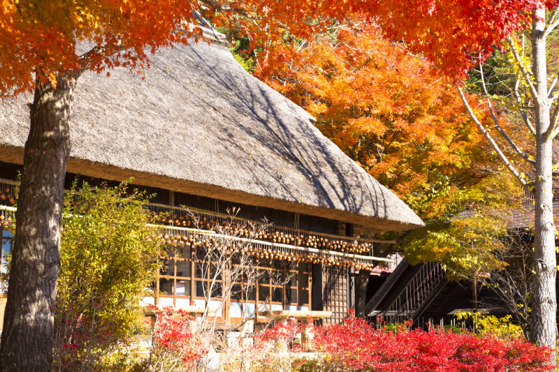 10月下旬から11月中旬頃には、里山が紅葉に染まり、よりノスタルジックな雰囲気に。懐かしさに浸りながら、モミジやイチョウに囲まれた茅葺屋根の風景を楽しめます。