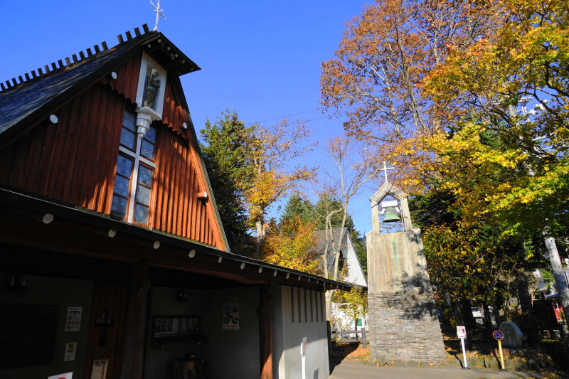 三角屋根が目印の可愛らしい外観の聖パウロパトリック教会は、木の温もりが感じられるあたたかい教会です。秋には教会を囲む木々が紅葉に染まり、洋風建築と和の風情が織りなす軽井沢ならではの景色が楽しめますよ。