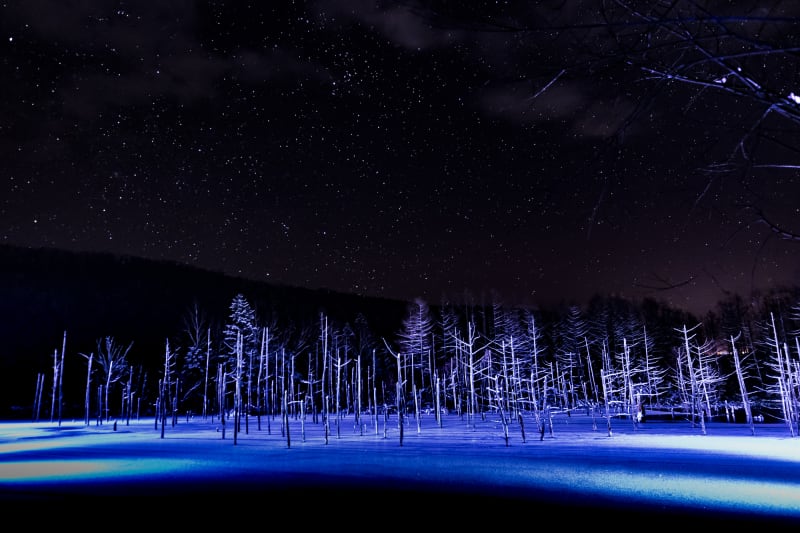 美瑛の人気スポット『青い池』。冬はあたり一面がまっしろに染まり、気温が高い日には青い池の透き通った青色との、映画の世界のような淡く美しい景色が楽しめます(12月から4月ごろの気温が低い日は水面に積雪しています)。
