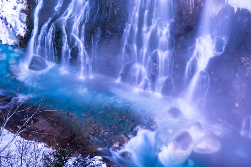 夏とは全く違う青と白の世界。美瑛ブルーと呼ばれるほどの神秘的な水景は、まっしろな冬によく映えています。