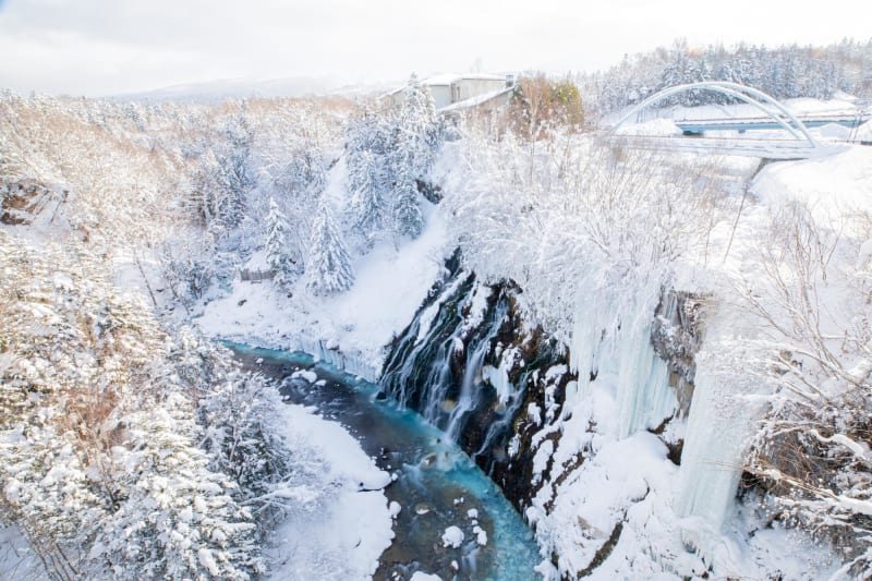 冬は、繊細に流れる滝が凍り、周囲にはつららもたくさん。厳しい北海道の冬ならではの景色が幻想的。
