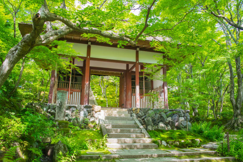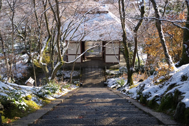 小倉山の中腹にある日蓮宗のお寺で、苔の緑が美しいことでも有名です。11月中旬には、周囲のあふれんばかりの紅葉が色付き、シーズンの終盤は、緑色の苔とのコントラストを楽しむことも。冬には儚くもうつくしい雪化粧も見られますよ。