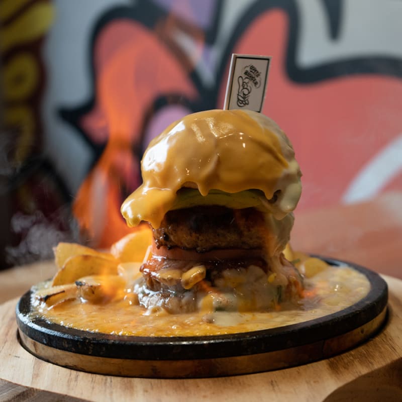 溶岩マグマのごとく、とろとろに溶けたたっぷりのチーズが乗ったバーガーは、チーズ好きにはたまらない! ポテトやサラダもついているので、ふたりでシェアすることも。