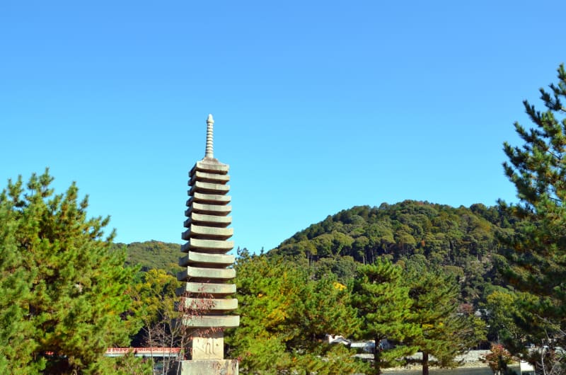 散策の際には川の眺めだけではなく、塔の島にそびえ立つ石塔にも注目。高さ約15メートルにものぼる石塔は、日本最大の高さを誇ることから重要文化財にも指定されています。