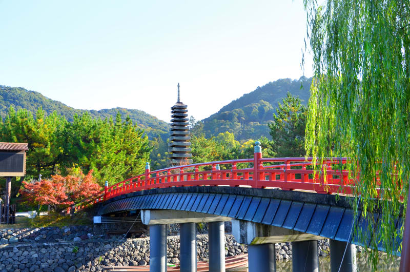 広く澄んだ「阿字池」が、お堂を取り巻く景色も特徴的。歴史的な壁画や色鮮やかな装飾がほどこされた堂内も必見です。