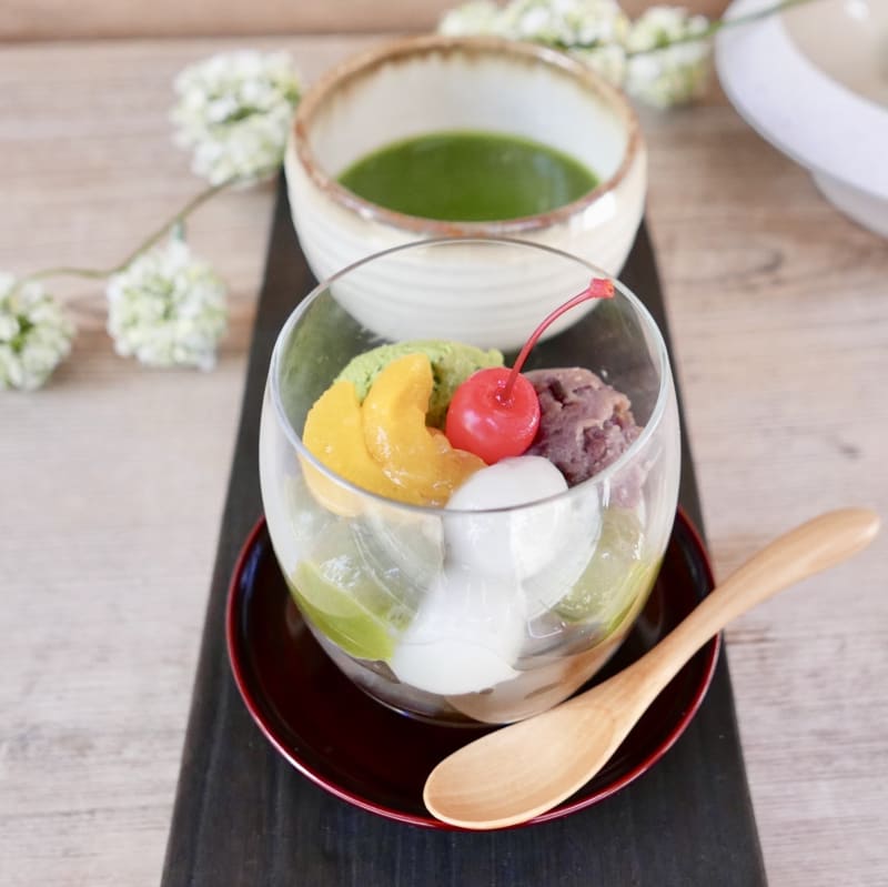 濃厚な黒蜜に潮香る寒天、抹茶のババロア、甘さ控えめのあんこ、そしてやわらかな茹でたての白玉はすべて自家製というこだわり!