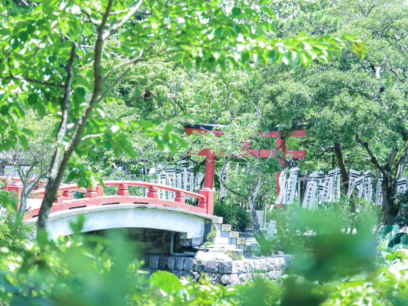 広い敷地内には本宮以外にも、風光明媚な景色が広がる「源氏池」やアーチが美しい「太鼓橋」、「ぼたん庭園」などもあるので、ゆっくりと散歩しながら訪れてみて。