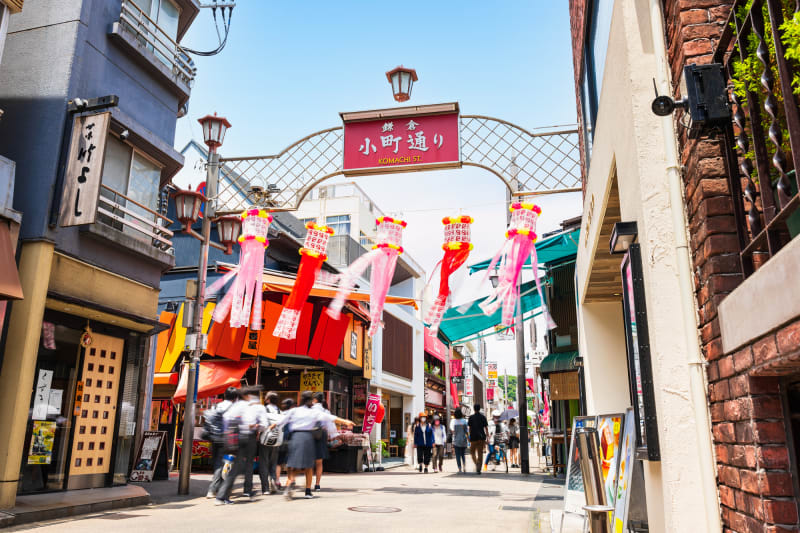 鎌倉グルメがいただけるレストランやカフェ、食べ歩きにぴったりな軽食販売、可愛らしい雑貨屋さんまで、さまざまなお店が軒を連ねる『小町通り』。