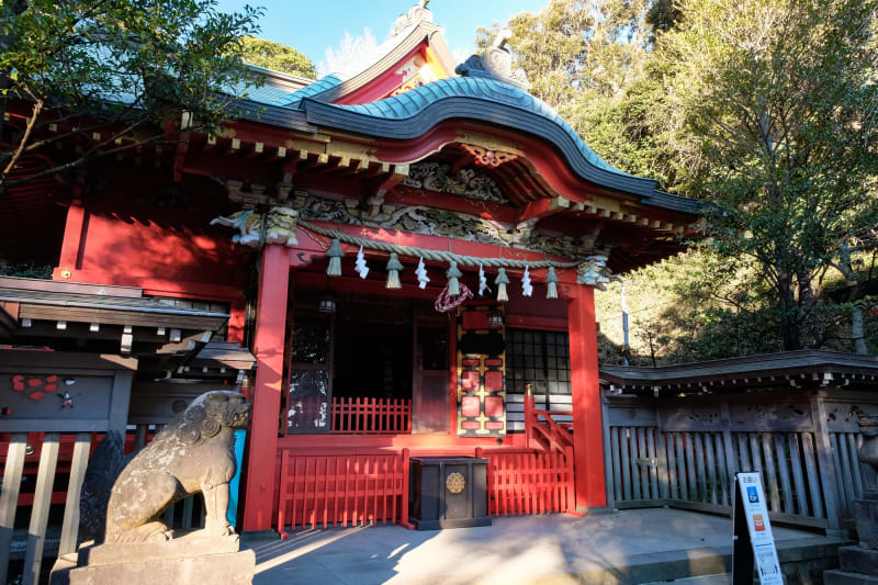 辺津宮から5分ほど歩くと、市寸島比賣命(いちきしまひめのみこと)を祀っている中津宮(なかつみや)に到着。真っ赤な社殿が特徴で、敷地内には江の島歌舞伎の手形や水琴窟なども飾られています。