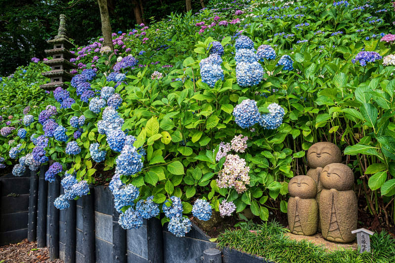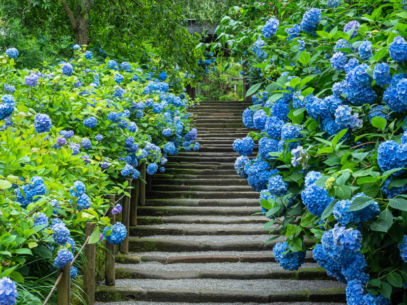 鎌倉はあじさいの名所が多いことで有名ですが、まずおさえておきたいのが『明月院』。境内には約2,500株ものあじさいが咲き誇り、その美しい色合いは「明月院ブルー」と呼ばれています。見ごろは、例年6月上旬から7月上旬まで。