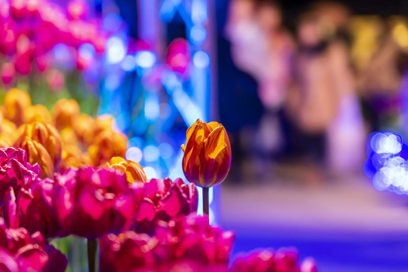 江の島サムエル・コッキング苑内では『湘南の宝石』と同時期、12月下旬頃から2万本以上のウィンターチューリップが開花。赤・黄色・ピンクと色とりどりのチューリップは見ているだけで心が明るくなります。冬に鎌倉・江ノ島を訪れる際は、ぜひ『湘南の宝石』のイルミネーションでライトアップされるチューリップを見に行きましょう。