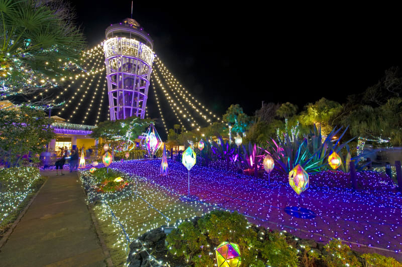 冬の江の島では、江の島シーキャンドル(江の島展望灯台)を中心に、例年11月から2月ごろまでエリア各所にイルミネーションが施されます。湘南の美しい風景に合ったデザインやその独自性から、 関東三大イルミネーションに数えられており、カップルに大人気のイベント。