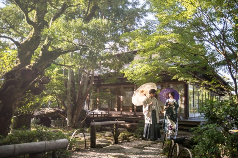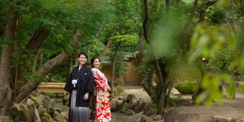 日本庭園ならではの侘び寂びのある風景は、和装でのフォトウェディングにぴったり。また、本格的な茶室で写真撮影できるのもポイント!