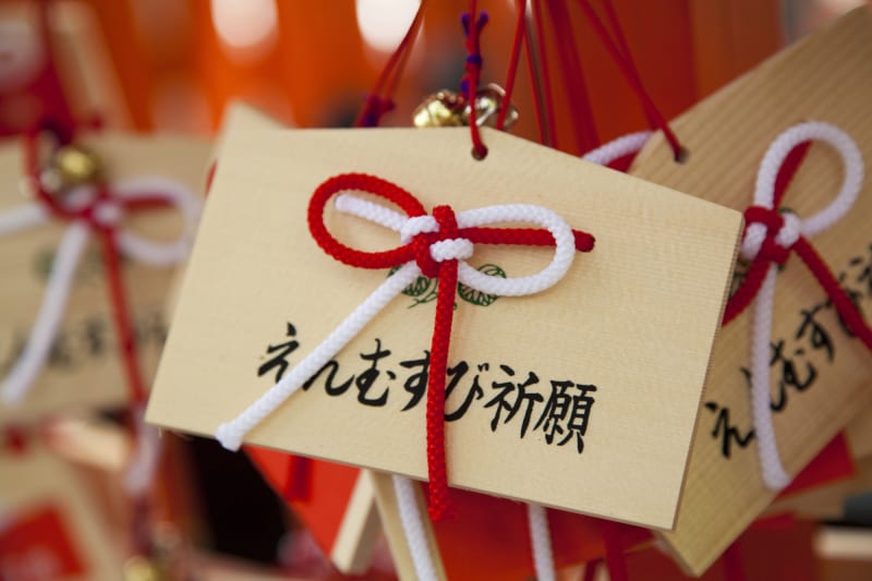 紅白の紐を結って奉納する絵馬に願い事を書いたら、ご神木を結ぶ綱を両端からおふたりで引き合うのが習わしです。ふたりの縁をより深く結び、円満な家庭を築けるよう心を込めてお参りしましょう。