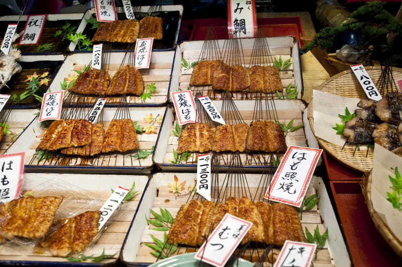 京都の高級食材 鱧を使った「ハモ天」や、新鮮な鰻がやさしいたまごに巻かれた「うなぎ巻」、錦名物として知られる「たこたまご」など、数えきれないほどのグルメが集結。