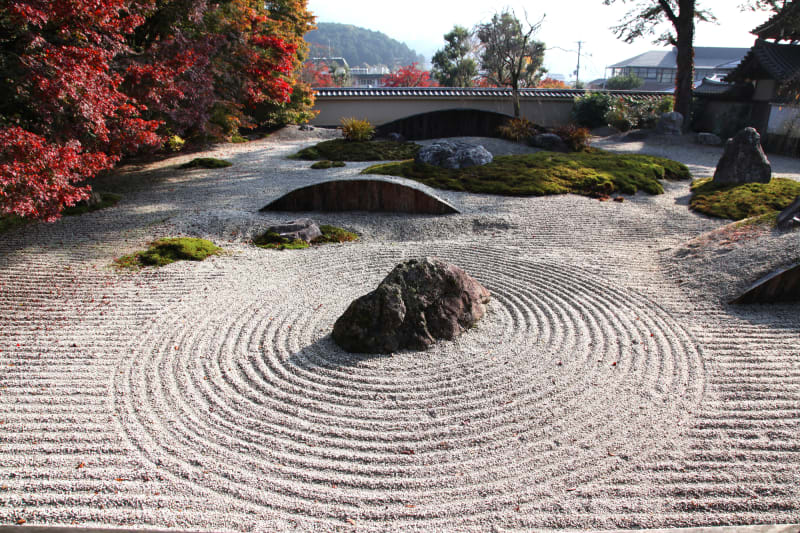 日本国を岩と苔で表現し、波を表現するアーチ形のオブジェが印象的。全体には白砂が敷かれ、比叡山を背景にしたのどかな風景が広がっています。春になると桜が咲き、和の春を堪能できますよ。