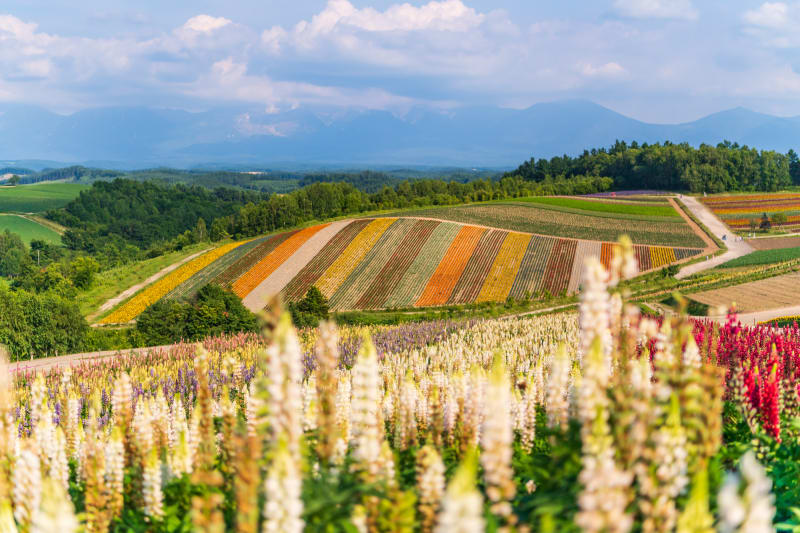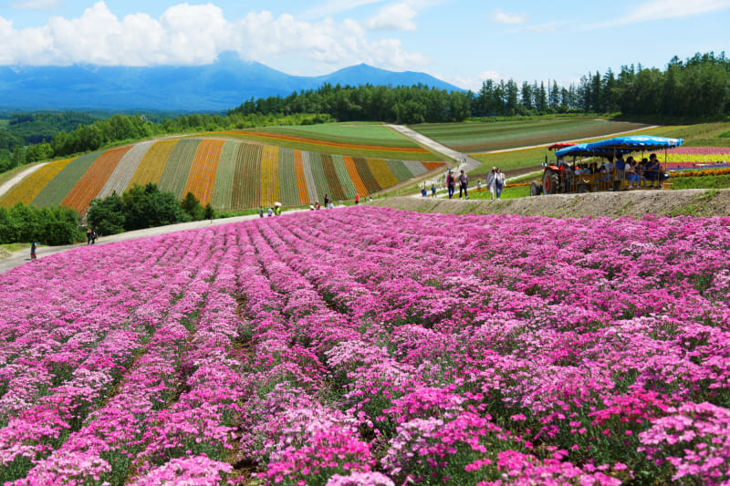 広大な展望花畑に四季折々の花が咲き乱れる『美瑛・四季彩の丘』。旭川市内から車で約40分ほどの場所にある美瑛の代表的な花園です。