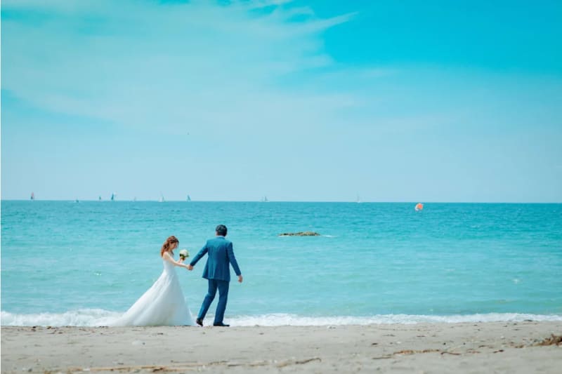海岸に浮かぶ小島・江の島を背景にした撮影をはじめ、夏場にはたくさんのヨットが漂う爽やかな1枚を撮れる『湘南』。昼間の明るい雰囲気も素敵ですが、水平線に沈みゆく夕日を背景に撮影するサンセットフォトもロマンチック。