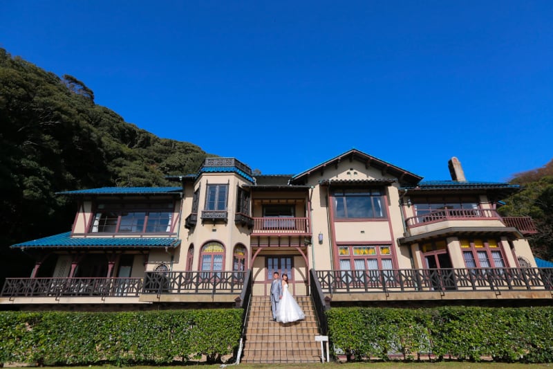 文芸派のふたりには『鎌倉文学館』もおすすめ。レトロな建築のお館とバラ園のコラボレーション、すこしリッチな雰囲気のなかで華やかなドレス姿を撮影できますよ。