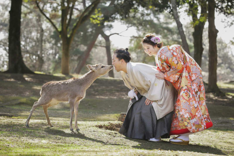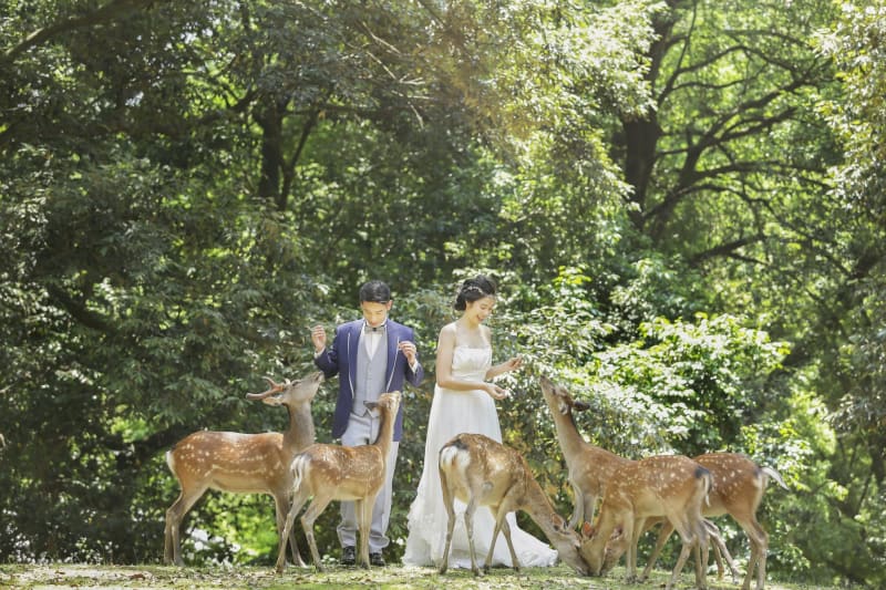 広大な敷地を誇る『奈良公園』では、かわいい鹿たちが悠々とくつろぐ、緑豊かなロケーション撮影を楽しめます。和装・洋装どちらにも合うスポットで、なごやかな雰囲気で写真撮影できるのが魅力。