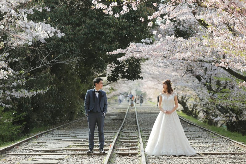 そのほか全長58mの線路が走る『蹴上インクライン』では、一風変わったレトロな写真を撮影することも。春には線路の両脇に咲く桜の花が、たなびくドレスの周りを舞い、ドラマチックなシーンを演出してくれます。