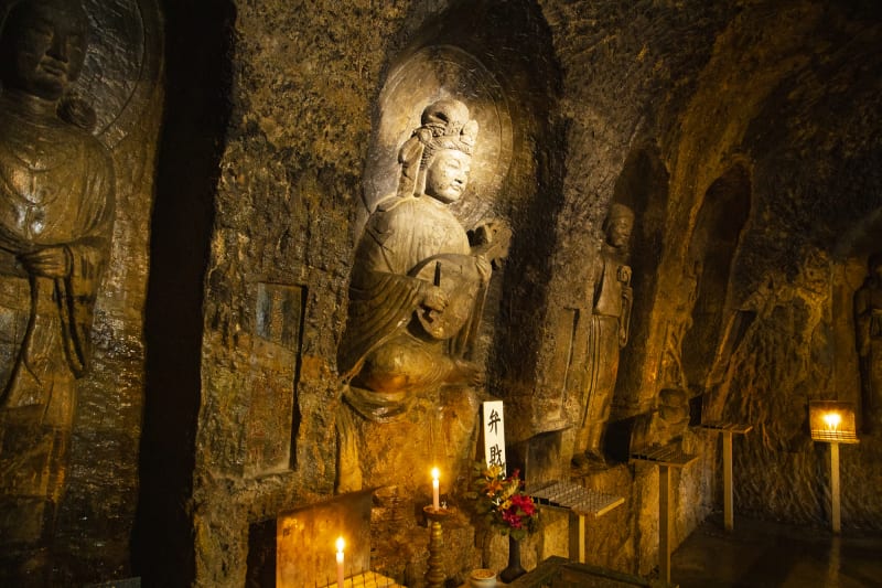 時間があれば『弁天窟(べんてんくつ)』にも足を運んでみて。洞窟内の壁面には、弁財天や十六童子などが彫られており、ありがたいご利益も賜れます。