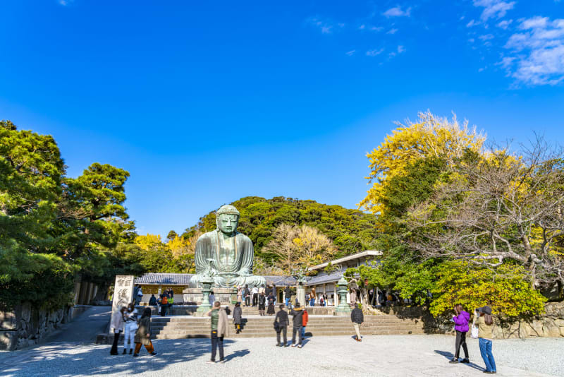 鎌倉のシンボル鎌倉大仏のある『高徳院』は、鎌倉観光に外せない人気のスポット! 高さ約11mの巨大な大仏像は圧倒的な存在感です。